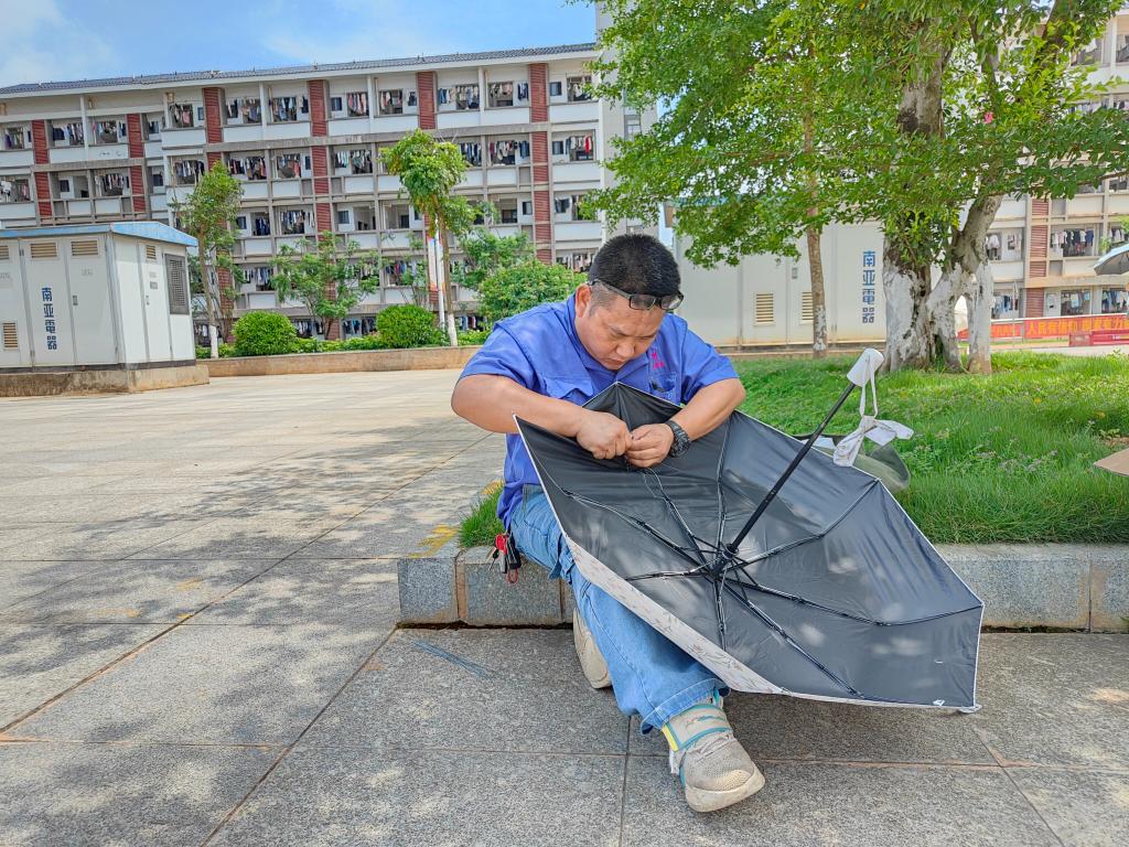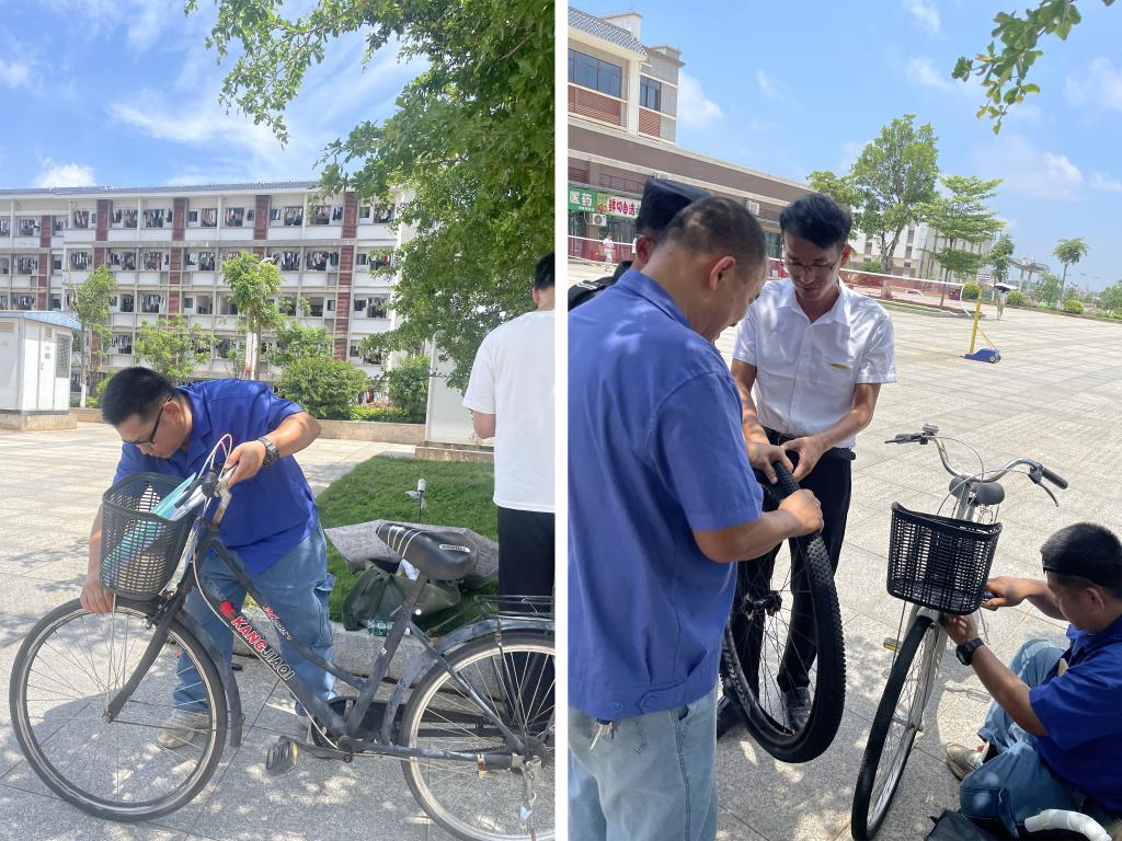 自行车维修区,专业的维修师傅忙着为师生的自行车排除故障、维修雨具,确保大家的出行安全。